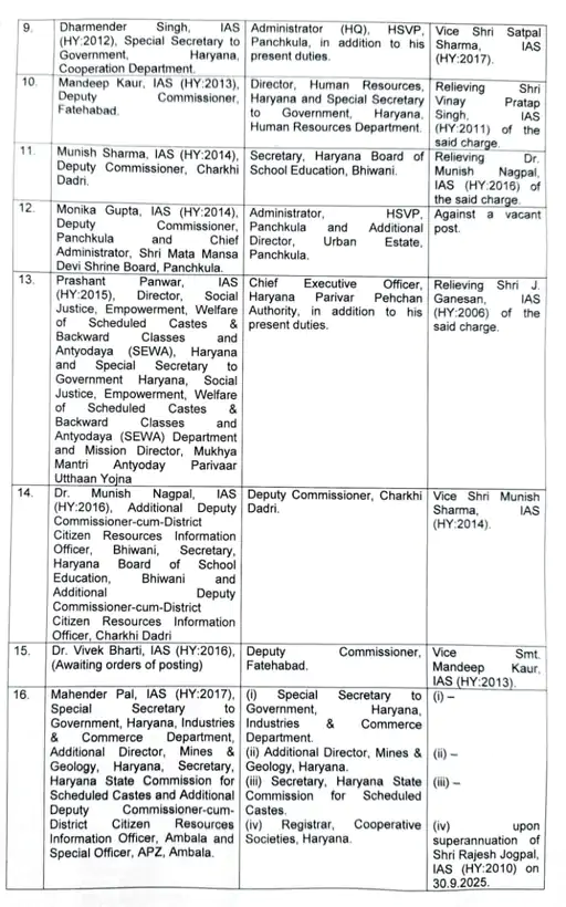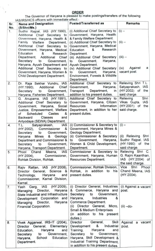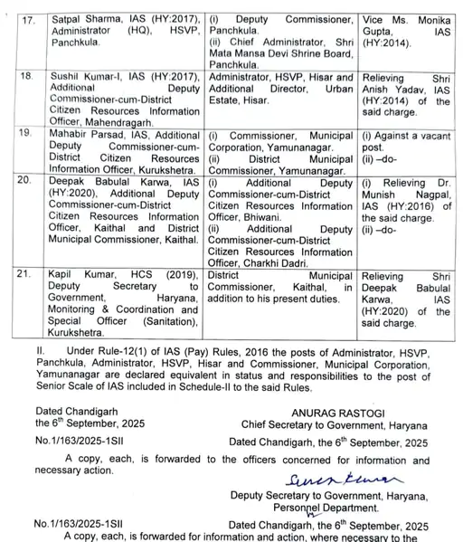 हरियाणा सरकार ने ब्यूरोक्रेसी में बड़ा फेरबदल किया है। इसमें 20 आईएएस अधिकारियों और एक एचसीएस का ट्रांसफर किया गया। डॉ. राजा शेखर वुंड्रू को ट्रांसपोर्ट डिपार्टमेंट का एडिशनल चीफ सेक्रेटरी बनाया गया है, जबकि जी अनुपमा को सिटीजन रिसोर्सेज इन्फॉर्मेशन डिपार्टमेंट का एडिशनल चीफ सेक्रेटरी और टीएल सत्यप्रकाश को वूमन एंड चाइल्ड डिपार्टमेंट का कमिश्नर सेक्रेटरी नियुक्त किया गया है।